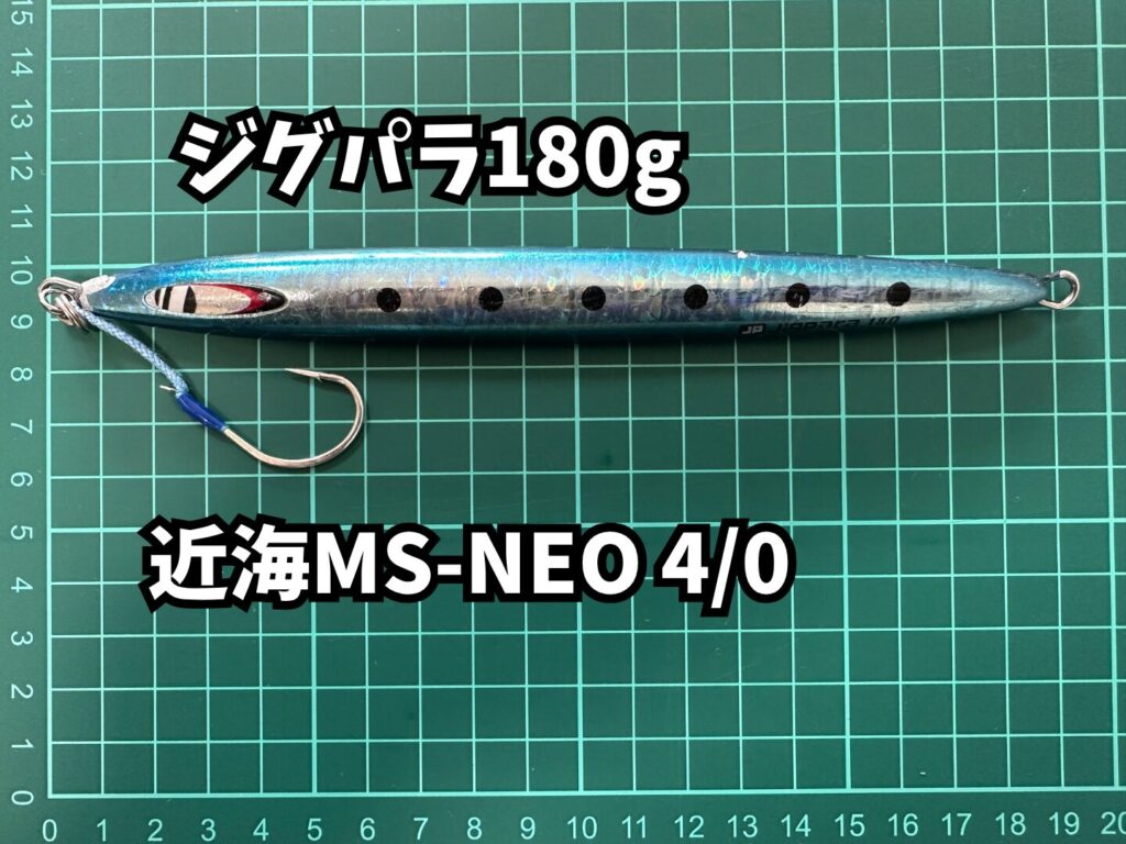 ポイント移動中にジギングロッドにリーダーを組み直し、ロストしたバリヤバイジグの代わりにジグパラ180gに近海MS-NEO 4/0をセッティング。
